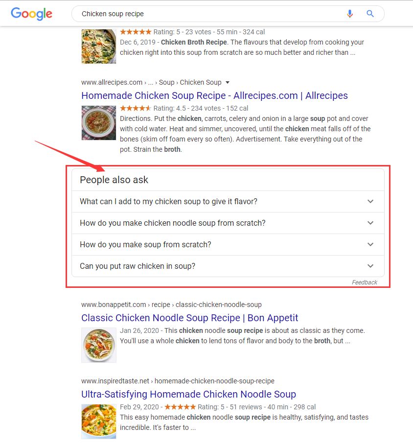 例如,如果有人搜索 [鸡汤配方] ,你可以假设他想知道如何做鸡汤。但其实他想知道的更多。滚动到搜索引擎结果页面的中间,你会发现谷歌的“People Also Ask”框,其中列出了一些与原始搜索字词有关的问题。